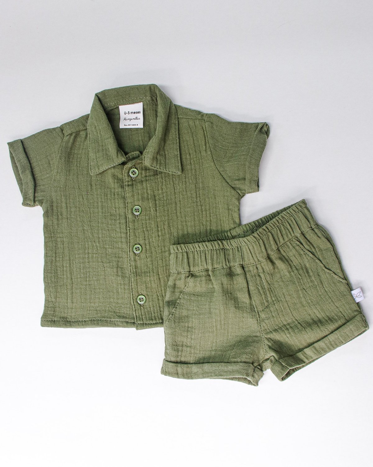 Camisa de mangas cortas dobladitas, con cuello y botoncitos delicados 👔✨ + bermudita con borde doblado que suma ese toque canchero.